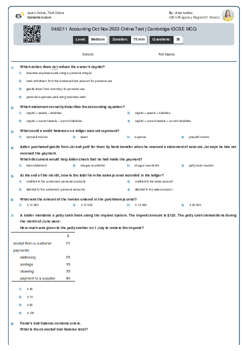 0452/11 Accounting Oct Nov 2023 Online Test | Cambridge IGCSE MCQ