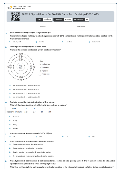 0652/11 Physical Science Oct Nov 2014 Online Test | Cambridge IGCSE MCQ
