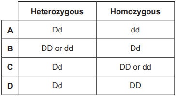 Which row shows all the possible genotypes for heterozygous and homozygous individuals?