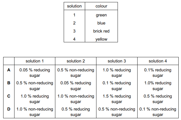Four sugar solutions were tested with a standard Benedict’s solution. The table shows the colour of the solutions after testing.