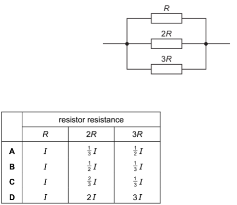 Using I to represent the current through the resistor of resistance R, which row represents the relationships between the currents through the resistors?