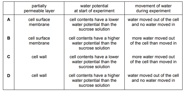 Four students, A, B, C and D, observed plant epidermal cells that had been placed in a concentrated sucrose solution for 30 minutes. They were asked to identify the partially permeable layer and to explain the appearance of the cells in terms of water potential and movement of water.