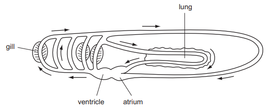 The diagram shows the circulatory system in a different organism. The arrows show the direction of blood flow in the vessels.