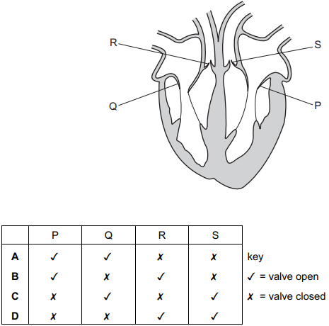 The diagram shows a section through the human heart. The four heart valves are labelled P, Q, R and S.
