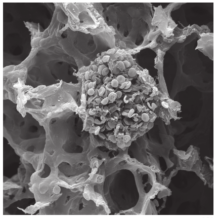 scanning electron micrograph of lung squamous epithelium and red blood cells