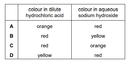Methyl orange is added to dilute hydrochloric acid and to aqueous sodium hydroxide.