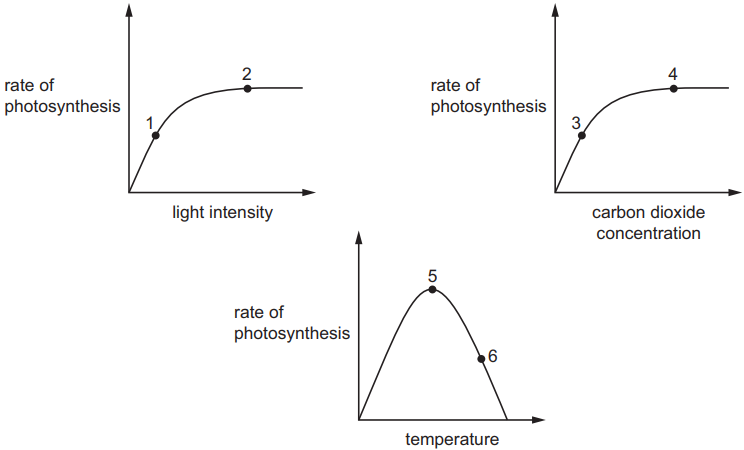 At which points on the graphs could the rate of photosynthesis be limited by the carbon dioxide concentration?
