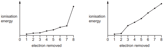 The first eight successive ionisation energies for two elements of Period 3 of the Periodic Table are shown in the graphs.