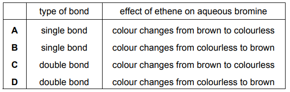 Which row shows the type of bond between the carbon atoms in ethene, and the effect of ethene on aqueous bromine?