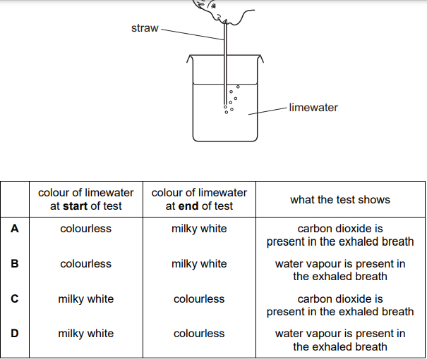 A student tests her exhaled breath by blowing through a straw into some limewater.
