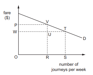 The number of passenger journeys per week by train on a route is shown by the demand curve in the diagram.