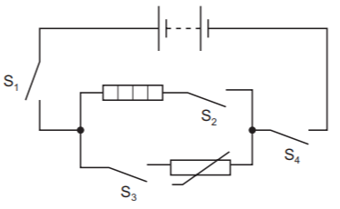 The circuit in the diagram contains four switches, S₁, S₂, S₃ and S₄.