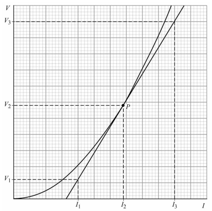 A tangent has been drawn on the curve at point P for a current of I$_2$.
