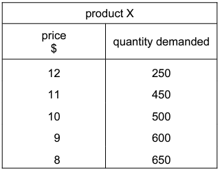 From the table below, in which price range is demand for product X inelastic?
