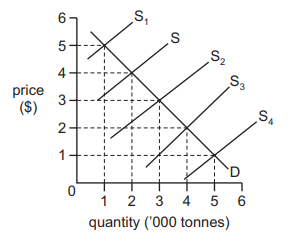 In the diagram, D is the demand curve of an agricultural commodity and S is the initial supply curve.