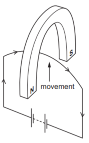 A wire is placed in a strong magnetic field. When a current is passed through the wire it moves upwards, as shown.