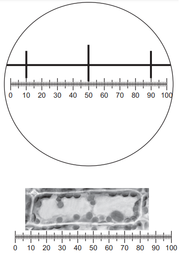 The diagram shows a stage micrometer on which the small divisions are 0.1 mm. It is viewed through an eyepiece containing a graticule.