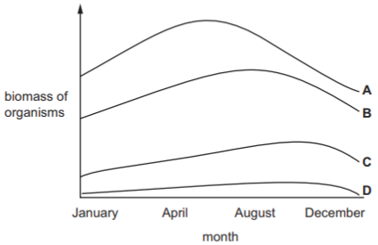 The graph shows changes in biomass of different organisms in an ecosystem over a 12 month period. Each line represents a different trophic level.