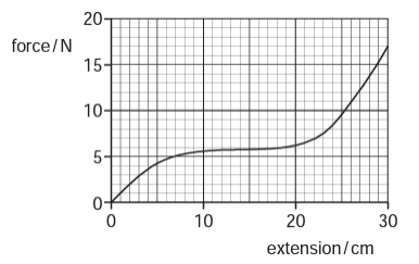 A rubber band is stretched by hanging weights on it and the force-extension graph is plotted from the results.