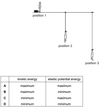 When bungee jumping, a student starts with maximum gravitational potential energy (position 1), then falls freely until the rope fully unwinds (position 2), after which the rope starts to stretch until the lowest point of the jump is reached (position 3).