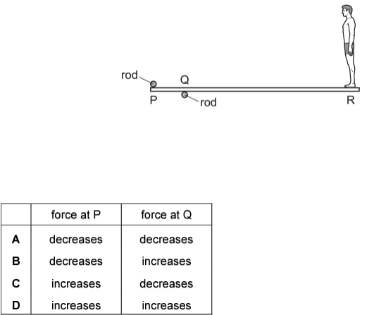 A uniform diving board is held by two fixed rods at points P and Q. A person stands at end R of the diving board, as shown.
