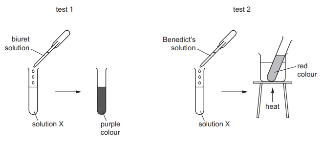 The diagram shows two food tests being carried out on solution X.
