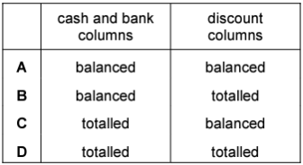 Which actions are taken in respect of the totals of a three-column cash book at the end of an accounting period?