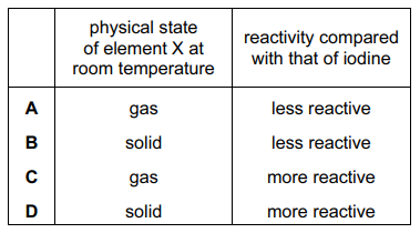 Which row correctly shows the physical state of element X at room temperature and its reactivity compared with that of iodine?