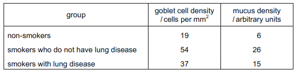Scientists compared the density of goblet cells in the lungs and the density of mucus in the lungs of three groups of people:
