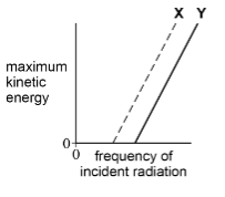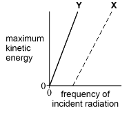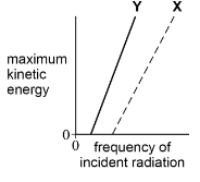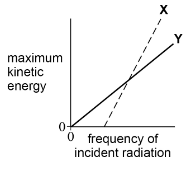 Line X on the graphs below shows how the maximum kinetic energy of emitted photoelectrons varies with the frequency of incident radiation for a particular metal.