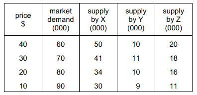 The table shows the market demand for a product and the individual supply of the three firms X, Y and Z in the industry.