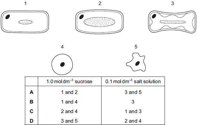 Some plant and animal cells were placed in different solutions and the results are shown.