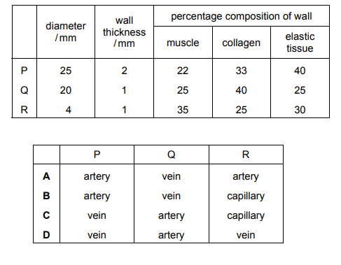 The table shows some information about three blood vessels, P, Q and R, from a mammal.
