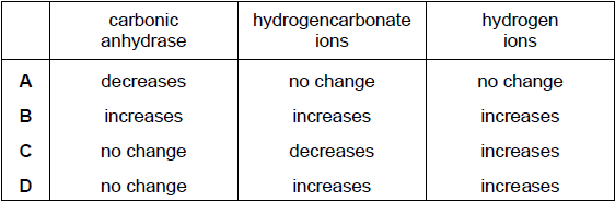 Which row shows the change in concentration of some substances in red blood cells when carbon dioxide diffuses from active cells?