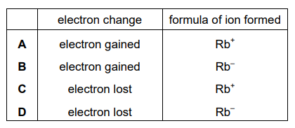 Which row shows the electron change taking place for rubidium and the correct formula of the rubidium ion?