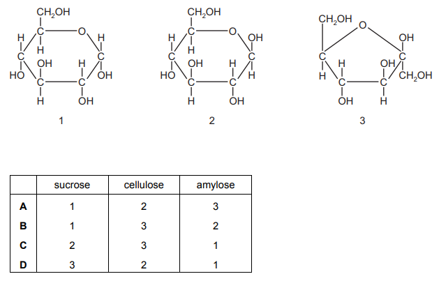 Which row correctly shows examples of carbohydrates in which these three hexose sugars occur?