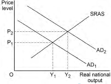 The diagram below shows two aggregate demand curves (AD) and the short-run aggregate supply curve (SRAS) for an economy.