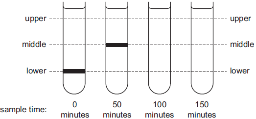 Which proportion of the DNA of the sample taken at 150 minutes will be at the upper position?