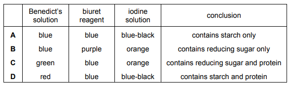 The table shows the observations recorded from tests for biological molecules on four samples,