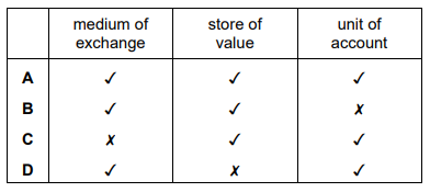Four students have to complete a table showing the functions of money.
