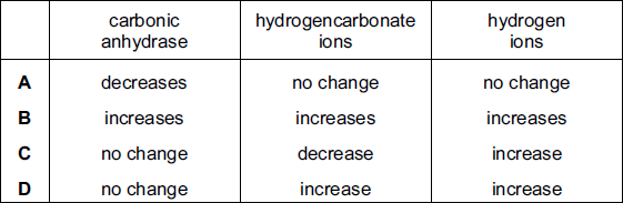 Which row shows the changes in concentration in the red blood cells when carbon dioxide diffuses from respiring cells?