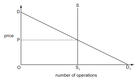 The diagram shows the demand curve, $D{D_1}$, and the supply curve, $S{S_1}$, for eye operations.