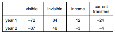 The table shows the balances for four items in a country’s current account on the balance of payments for two years.