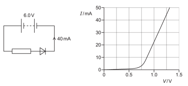 A fixed resistor and a diode are connected in series to a battery of electromotive force (e.m.f.) 6.0 V and negligible internal resistance. The graph shows the variation with potential difference (p.d.) V of the current I for the diode.