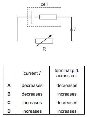 A cell with internal resistance is connected to a variable resistor R as shown.