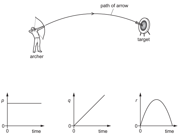 target The graphs show how three different quantities p, q and r, relating to the motion of the arrow, vary with time.