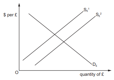 The diagram shows a freely floating foreign exchange market in the United Kingdom (UK) for the demand and supply of pounds sterling (£) in exchange for United States (US) dollars ($).