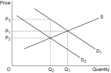 The following diagram shows the free market supply (S) and demand (D$_1$) for a good when there is imperfect information.D$_2$ shows the level of demand if consumers had full information about the effects of consuming the good.