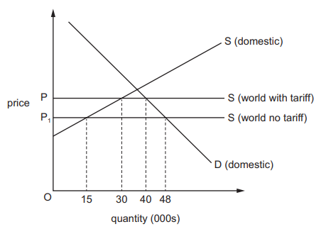 The diagram shows the effect on the quantity of an import to the domestic market of the removal of a tariff that reduces the import’s price to ${P_1}$.