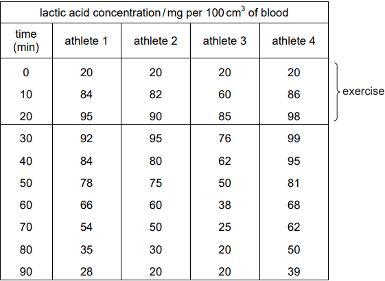 The table shows the concentration of lactic acid in the blood of four different athletes. They exercise for 20 minutes and rest for the next 70 minutes.